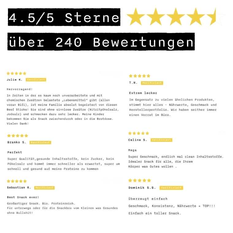 Du wirst die Bio Beef Sticks sicher lieben - wie tausende andere Kunden auch. Für den Fall, dass dir unser Produkt trotzdem nicht schmeckt, hilft dir unsere Geschmacksgarantie. In diesem Fall nehmen wir unser Produkt innerhalb von 30 Tagen ohne Wenn und Aber zurück und erstatten dir den Kaufpreis. Fülle dazu einfach den Widerruf mit dem Stichwort "Geschmacksgarantie" aus und lass ihn uns zukommen. Teil uns gerne dein Feedback mit, damit wir es in Zukunft besser machen können.