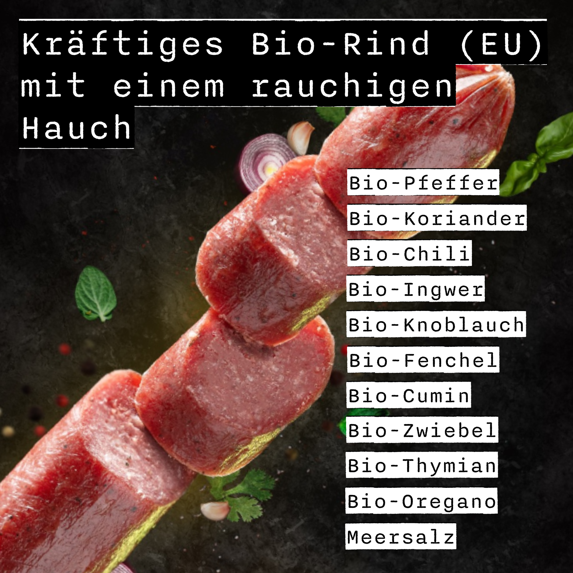 Bio Rindfleisch Stick nach Art einer Kochsalami ohne Umrötung: Rindfleisch*, Meersalz, Pfeffer*, Koriander*, Chili*, Ingwer*, Knoblauch*, Fenchel*, Cumin*, Zwiebel*, Thymian*, Oregano*, färbendes Lebensmittel Rote Bete Pulver*, Acerolapulver*, Reifekulturen. *aus kontrolliert biologischem Anbau