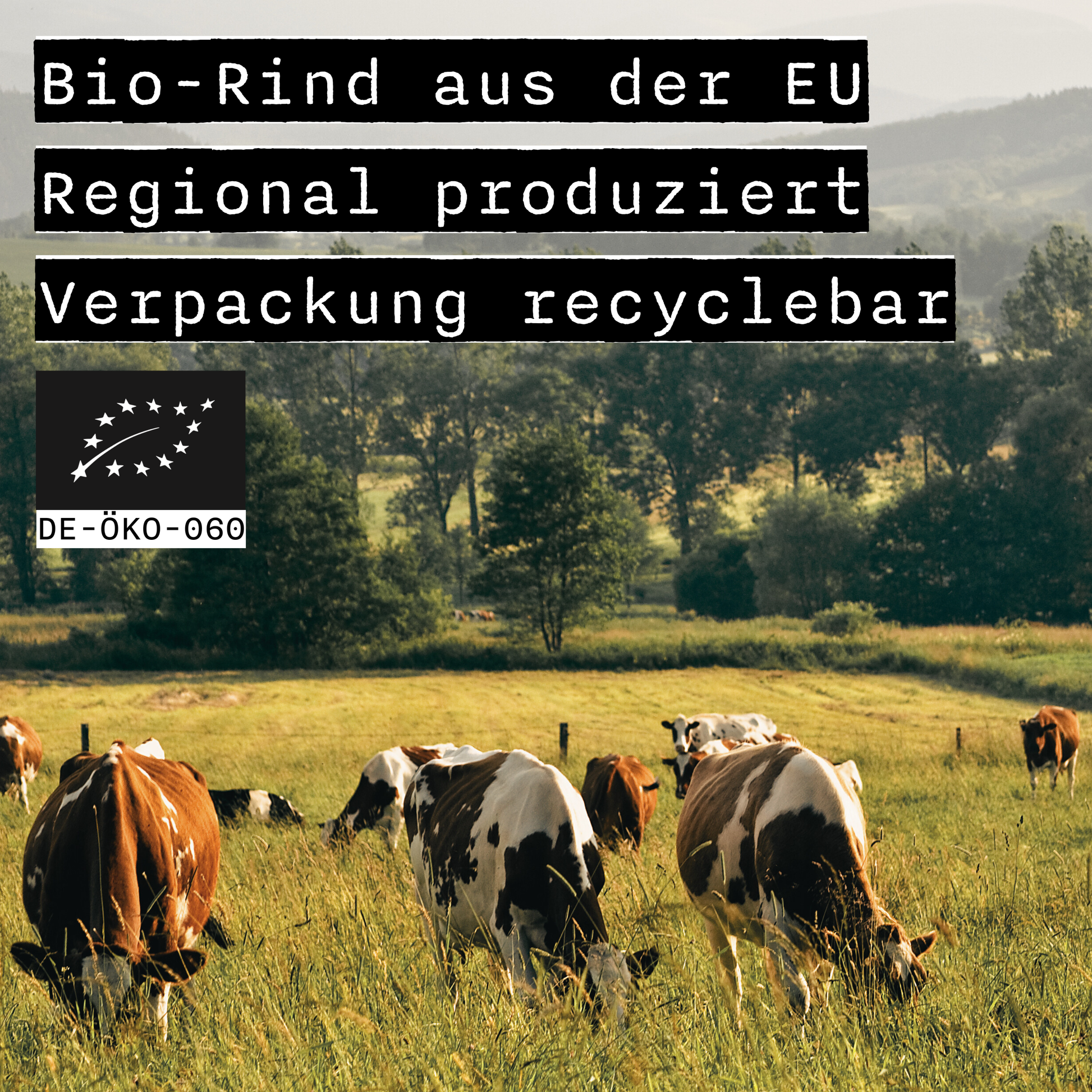 Hergestellt aus Fleisch von Tieren aus artgerechter Haltung – für bewussten Genuss. Verpackt in recycelbare Materialien und produziert in Bayern.